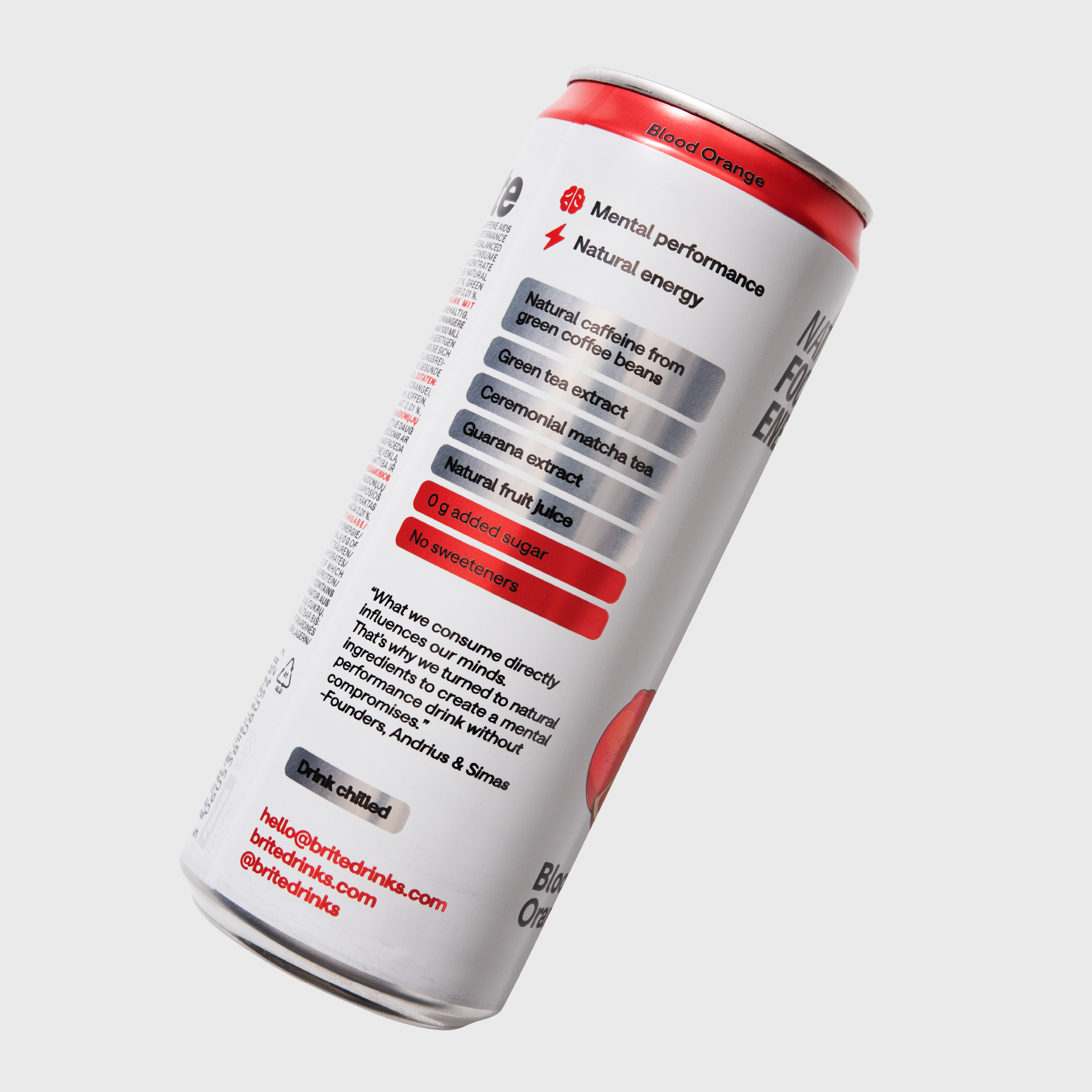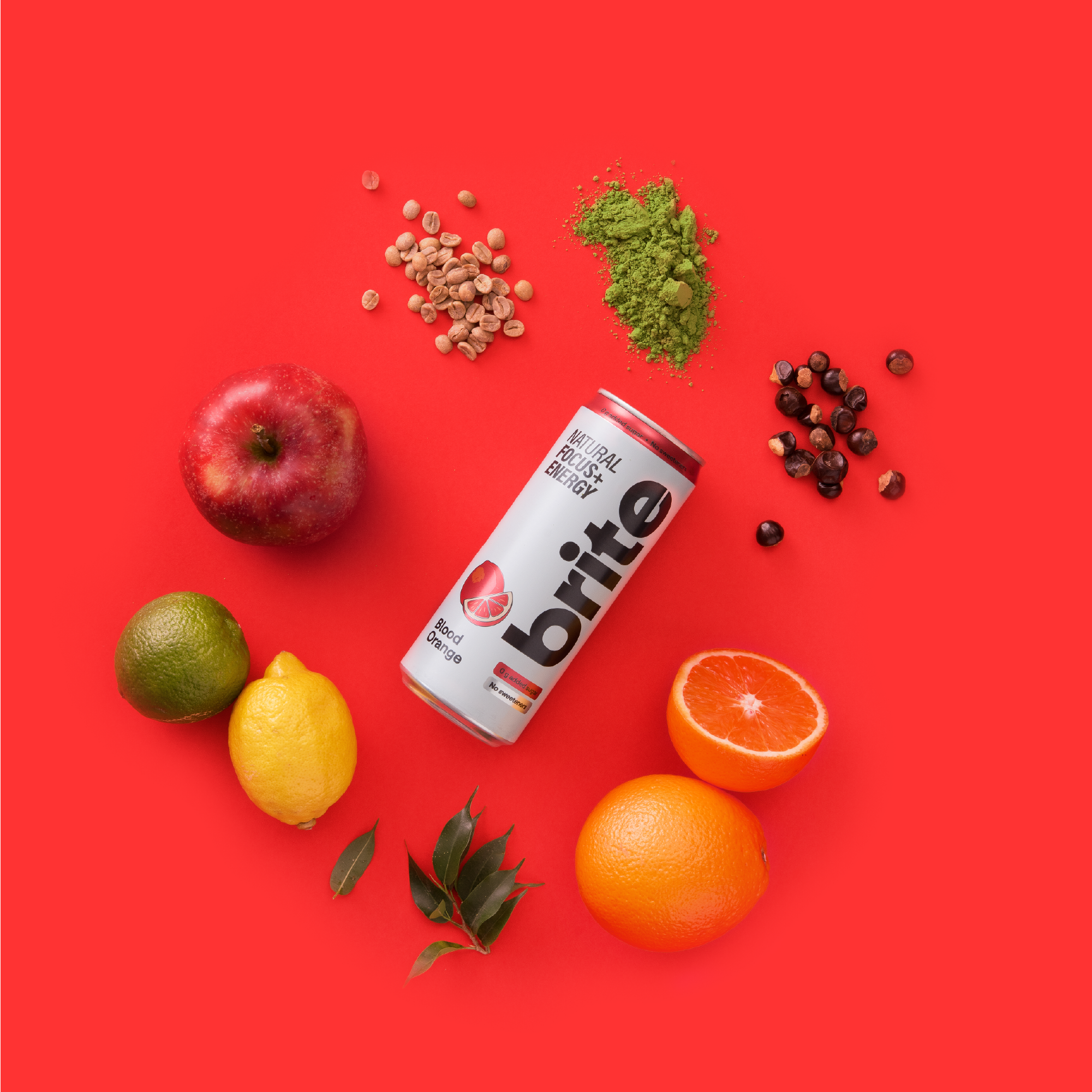 Blood Orange: natural extracts (green tea, green coffee beans, guarana), matcha tea organic ceremonial grade, fruit juice (apple, blood orange), natural flavourings, sparkling water